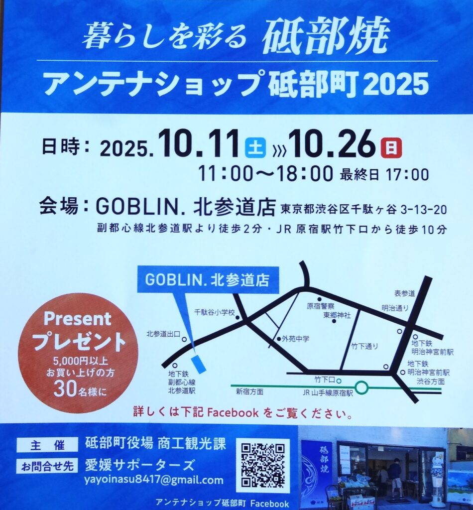 2025年10月10日 イベント アンテナショップ砥部町 2025.10.11~26 東京で「アンテナショップ 砥部町」が開催されます砥部焼の他、七折小梅の梅干し、梅シロップ、有機栽培みかんジュースなど、砥部町の特産品も出展されております この機会にぜひご来場ください会期:2025年10月11日(土)~ 10月26日(日) 11:00~18:00(最終日17:00まで)会場:GOBLIN.北参道店住所:東京都渋谷区千駄ヶ谷3-13-20